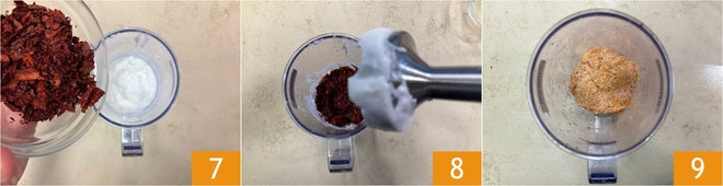Incorpora los pimientos secos desmenuzados 7, bate de nuevo para mezclar 8 y reserva la mayonesa obtenida 9.
