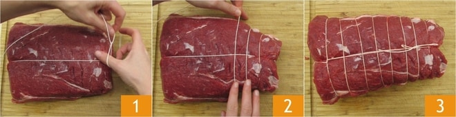 Para realizar el estofado al Buttafuoco, primero eliminad el exceso de grasa y la nervadura del 'cappello del prete' y proceded con el amarrado para darle una forma regular: atad la carne a lo largo con hilo de cocina, luego cread un lazo 1 y pasad la carne por dentro. Continuad de esta manera distanciando los anillos un par de centímetros 2 hasta crear una jaula que cerraréis con un doble nudo 3.