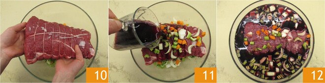 Colocad la carne en el bol 10 y verted el vino 11 para cubrirla completamente 12. Cubrid con film transparente y dejad marinar durante medio día, o toda la noche, en el frigorífico, volteando la carne un par de veces.