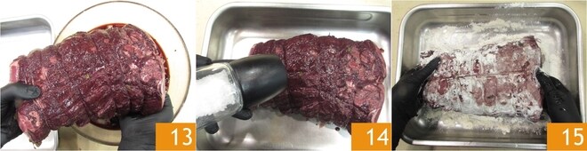Pasado este tiempo, sacad la carne de la marinada 13, secadla y ponedla en una bandeja, luego salarla 14 y enharinarla bien por todos lados 15.