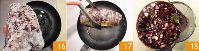 Dorad la carne enharinada en una sartén con un poco de aceite 16, girándola por todos los lados con pinzas para sellarla bien y evitar perforarla 17. Reservad la carne dorada y escurrid las verduras de la marinada filtrando el líquido y reservándolo 18.