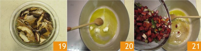 Mientras tanto, poned los hongos secos en remojo en el agua durante unos 30 minutos 19. En una cacerola grande, derretid la mantequilla en el aceite 20, luego añadid las verduras de la marinada 21.