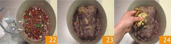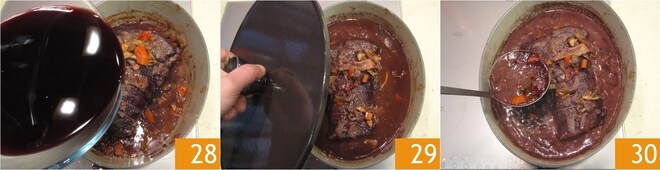 En este punto verted el vino de la marinada 28: la carne deberá quedar cubierta hasta dos tercios. Cubrid con la tapa 29 y coced a fuego moderado durante 3 horas. De vez en cuando mojad la superficie de la carne 30 y comprobad que no se pegue al fondo, asegurándoos de que el líquido siempre esté hirviendo.