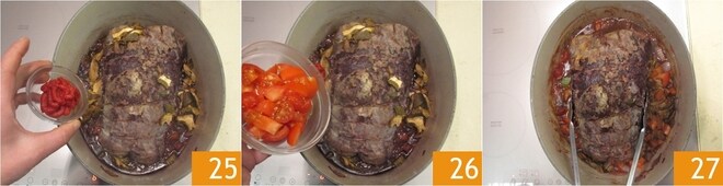 Agregad el concentrado de tomate 25 y los tomates frescos picados groseramente 26, luego dad la vuelta a la carne con las pinzas de cocina 27.