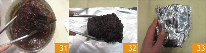 Transcurrido el tiempo de cocción, sacad la carne de la cacerola 31 y colocadla sobre una hoja de papel de aluminio que habréis untado previamente con mantequilla 32. Conservad la carne en el paquete para mantenerla caliente y evitar que se seque 33.
