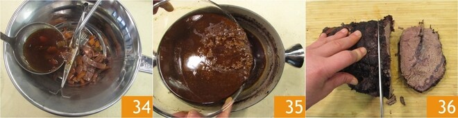 Sacad también las verduras y pasadlas por un pasapurés para eliminar las fibras 34, luego triturad la mezcla con una batidora de mano a través de un chino para hacer la salsa más fina. Verted nuevamente la salsa en la cacerola 35 y reducidla al fuego. Ahora recuperad el estofado y quitad el hilo, luego cortadlo en rodajas 36.