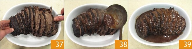 Transferid las rodajas de carne a un plato de servir 37 y cubrid con la salsa obtenida 38. ¡Vuestro estofado al Buttafuoco está listo para ser servido 39!