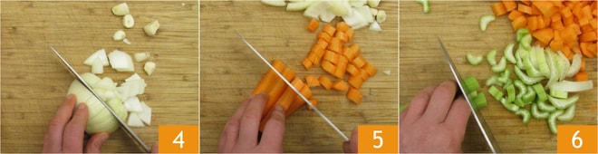 Pasad a las verduras: después de pelarlas, cortad el ajo y la cebolla en trozos bastante grandes 4, luego picad groseramente la zanahoria 5 y el apio 6.