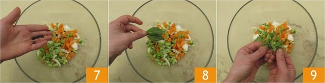Verted todas las verduras en un bol muy grande junto con las bayas de enebro y los clavos de olor 7, luego añadid también las hojas de laurel 8 y de mejorana 9.