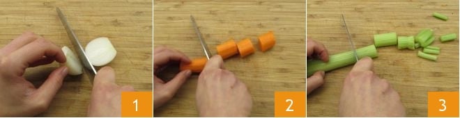 Para realizar el estofado al Oporto con manzanas y romero, primero lava y pela las verduras y luego córtalas groseramente (1-2-3).