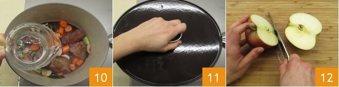 Añade agua 10, sala, pimienta y cubre con la tapa 11 y cocina de esta manera a fuego lento durante al menos dos horas. Mientras tanto, ocúpate de las manzanas: lávalas y córtalas por la mitad 12;