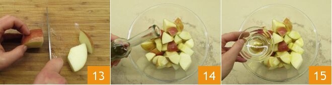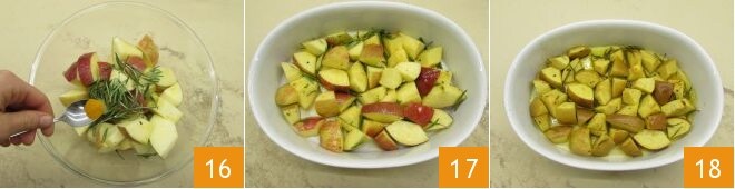 y romero. Sala, pimienta y aromatiza con cúrcuma 16, mezcla para sazonar las manzanas. Engrasa con aceite una fuente para horno, vierte las manzanas sazonadas 17 y cocínalas en horno estático precalentado a 180° durante unos 20 minutos. Una vez listas 18, mantén las manzanas calientes.