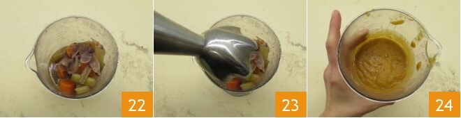 y toma solo las verduras, colócalas en el vaso alto de la batidora 22 y tritúralas con la batidora de mano 23 para obtener un puré 24.