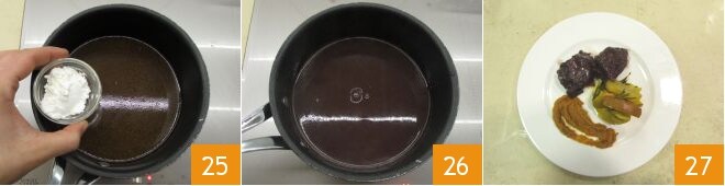 En un cazo, vierte el fondo de cocción restante, añade la maicena 25 y reduce la salsa a fuego lento 26. Sirve el estofado con las manzanas, el puré de verduras y rocía la carne con la salsa hecha con el fondo de cocción 27.