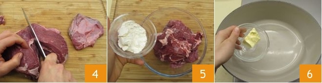 Ahora corta la carne en trozos de unos 200 g 4 y pásala por harina 5. En una cazuela grande, vierte la mantequilla y derrítela a fuego moderado 6.