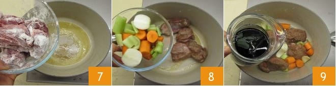 Una vez derretida la mantequilla, añade la carne enharinada 7 y dóralo por todos los lados durante unos minutos. Cuando la carne esté bien dorada, añade las verduras 8, el laurel, las bayas de enebro y el vino Oporto 9.