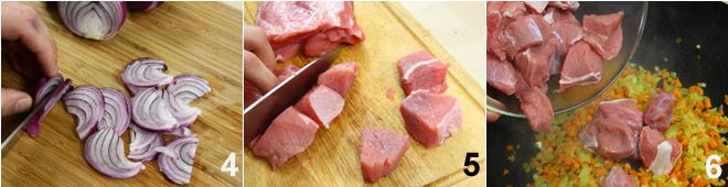 Corte en rodajas finas también las cebollas 4 y déjelas a un lado. Mientras tanto, prepare la carne: corte la ternera en trozos pequeños 5 y cuando el sofrito esté listo, añada los pedazos de carne 6 y dórelos.