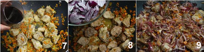 Desglase con el vino tinto 7 y añada las rodajas de cebolla 8. Continúe la cocción a fuego lento 9 añadiendo poco a poco el caldo de carne,
