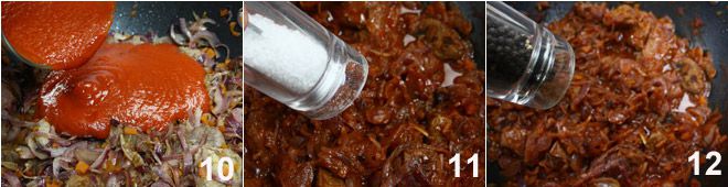 finalmente incorpore el puré de tomate 10. La cocción del estofado requerirá aproximadamente 1 hora. Una vez que la salsa haya sido absorbida por la carne, ajuste de sal 11 y pimienta 12. El estofado de carne con cebollas estará listo cuando la carne esté tierna y las cebollas bien cocidas.