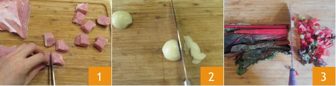 Para preparar el estofado de cerdo con lentejas especiado, primero cortad el lomo en cubos de aproximadamente 2,5 cm 1, luego picad finamente la cebolla 2 y cortad las hierbas en trozos pequeños 3.