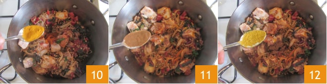 Añadid también la cúrcuma 10, la canela 11 y el curry 12.