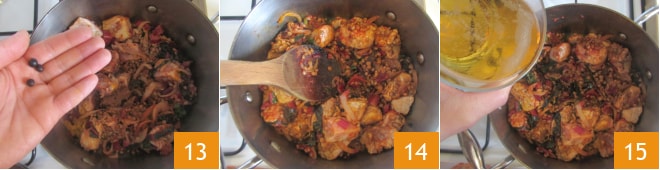 Incorporad las bayas de enebro 13 y mezclad bien 14, luego cubrid con la cerveza 15.