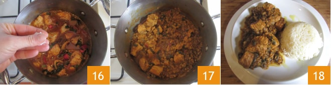 Salad 16 y cocinad a fuego lento durante aproximadamente una hora: la consistencia debe ser jugosa pero no líquida 17. Servid vuestro estofado de cerdo con lentejas especiado acompañado con arroz basmati 18!