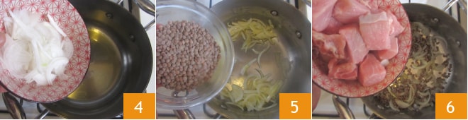Verted un chorrito de aceite en una cazuela, añadid las cebollas 4 y sofreíd a fuego lento hasta que estén blandas, removiendo frecuentemente. En este punto, añadid las lentejas 5 y tostád durante unos segundos, luego incorporad los cubos de carne 6 y doradlos por todos los lados.