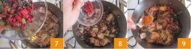 Incorporad las hierbas 7, luego sazonad con el concentrado de tomate 8 y el chile 9.