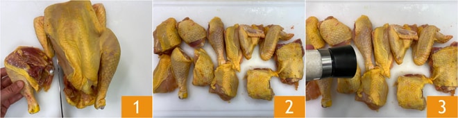 Para preparar el estofado de pollo con castañas y setas, primero corten el pollo en trozos 1 2, luego salan la carne 3.