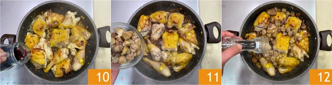 Desglasen con el vino tinto 10 y dejen evaporar la parte alcohólica durante 2-3 minutos, después añadan las castañas 11. Ajusten de sal y pimienta 12 y mezclen.
