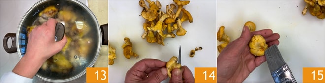 Tapen con una tapa 13 y cocinen a fuego bajo durante 40-50 minutos. Mientras tanto, limpien las chantarelas eliminando la parte final del tallo 14, luego eliminen los restos de tierra con un pincel 15.