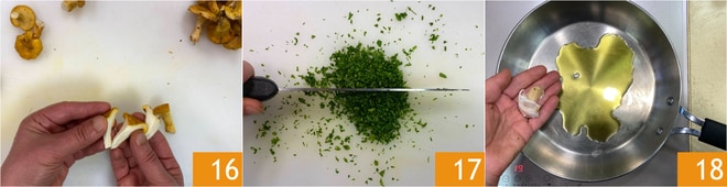 Con las manos, dividan las chantarelas a la mitad o en más partes, según el tamaño 16. Piquen el perejil con un cuchillo 17. En una sartén, dejen aromatizar un hilo de aceite con los dientes de ajo en camisa machacados 18.