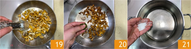 Añadan las chantarelas, salpimienten 19. Aromaticen con el perejil picado 20 y salteen durante unos minutos a fuego alto. Manténganlas calientes, o añádanlas al pollo. Ahora dedíquense a la preparación de la polenta: en una olla viertan el agua, añadan la sal 21 y lleven a ebullición.