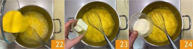 Viertan la harina de maíz mezclando con un batidor para no formar grumos 22. Cocinen durante 30-40 minutos removiendo continuamente, hasta que la polenta se despegue de los bordes de la olla. Apaguen el fuego y mantequen con mantequilla 23 y Parmesano Reggiano DOP rallado 24.