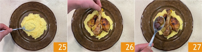 Emplaten distribuyendo la polenta en el fondo 25, coloquen encima el pollo 26 y añadan las castañas 27.