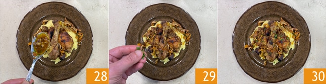 Completen con las setas 28 y el perejil picado 29. ¡Su estofado de pollo con castañas y setas está listo para ser servido 30!