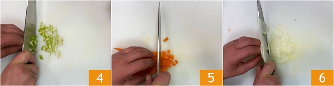 Corten el apio en cubitos 4, luego pelen las zanahorias y también redúzcanlas en cubitos 5. Corten la cebolla en rodajas 6.
