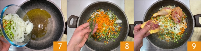 En una olla grande calienten el aceite a fuego medio-bajo, luego añadan las verduras 7, el tomillo 8 y los trozos de pollo 9. Doren la carne por todos los lados hasta que se dore.