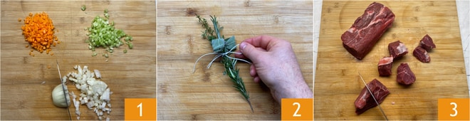 Para preparar el estofado de ternera, primero haced el caldo de carne siguiendo nuestra receta y mantenedlo caliente. Preparad el resto de los ingredientes: limpiad y cortad en cubitos el apio, la zanahoria y la cebolla 1. Con una cuerda atad juntos la salvia, el romero y el tomillo 2. Finalmente, cortad la carne en cubos de aproximadamente 5 cm 3.