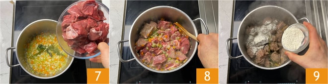 Pasados 10 minutos, subid el fuego y añadid los trozos de ternera 7, mezclando de vez en cuando para sellar bien la carne 8. Ajustad de sal, añadid la harina 9 y mezclad para integrarla.