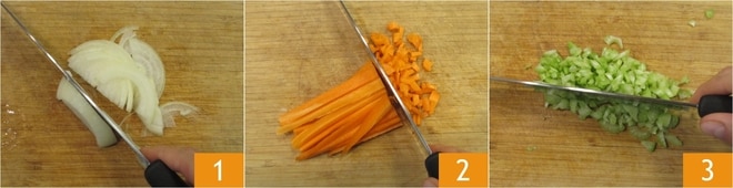 Para preparar el estofado en olla a presión, primero prepara las verduras para el sofrito: limpia y corta finamente la cebolla 1, luego corta en cubitos muy pequeños la zanahoria 2 y el apio 3.