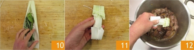 Mientras tanto, envuelve las hierbas dentro de una hoja de puerro 10 y átalas con hilo de cocina (si no tienes la hoja de puerro, puedes simplemente atar las hierbas con el hilo dejando la salvia y el laurel afuera y el romero adentro) 11. Añade el ramo de hierbas en la olla 12.