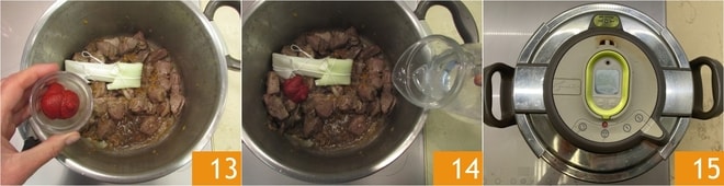 Vierte también el concentrado de tomate 13 y el agua 14, luego mezcla. Cierra con la tapa y lleva a presión 15. Cuando escuches el silbido, baja el fuego y cocina durante 15 minutos.