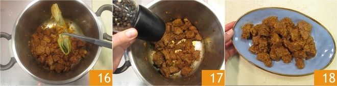 Transcurrido este tiempo, apaga el fuego y levanta la válvula para dejar salir el vapor, luego abre la tapa. Elimina el ramo de hierbas 16 y ajusta de sal y pimienta 17. ¡El estofado en olla a presión está listo para ser servido bien caliente 18!