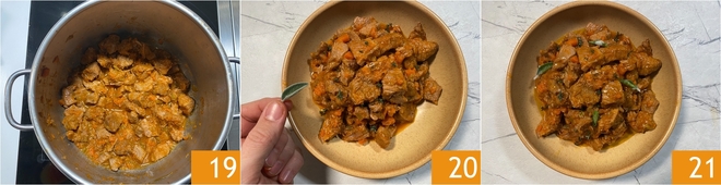 Si queréis un estofado más seco, dejad la olla al fuego un par de minutos más 19. Servid con hojas de salvia fresca 20 y vuestro estofado en olla a presión ya está listo para servir 21!