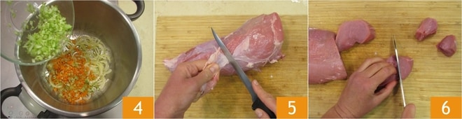 Vierte un chorrito de aceite en la olla a presión, añade las verduras 4 y déjalas sofreír durante 4-5 minutos. Mientras tanto, elimina la grasa de la carne 5 y córtala en trozos pequeños 6.