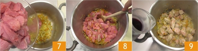 Agrega los trozos de carne al sofrito 7 y sofríe durante unos minutos a fuego medio-alto, revolviendo para sellarlos por todos lados 8. En este punto, añade el vino tinto 9 y deja que se evapore completamente.