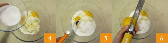 y el azúcar 4. Aromaticen con las semillas de la vaina de vainilla 5 y con la ralladura de naranja o de limón 6.