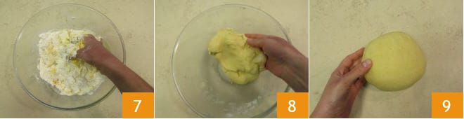 Amasen los ingredientes a mano 7. Una vez que hayan reunido todos los ingredientes 8, trasládense a una superficie de trabajo y formen un bloque liso y homogéneo 9.